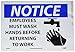 | Feature | Header "NOTICE" and Legend "EMPLOYEES MUST WASH HANDS BEFORE RETURNING TO WORK" with Graphic |