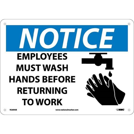 NMC N269PB NOTICE - EMPLOYEES MUST WASH HANDS BEFORE RETURNING TO WORK – 14 in. x 10 in. Vinyl Notice Sign with Graphic, Black/White Text on Blue/White Base