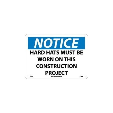 NMC N283AB NOTICE - HARD HATS MUST BE WORN ON THIS CONSTRUCTION PROJECT – 14 in. x 10 in. Aluminum Notice Sign with White/Black Text on Blue/White Base