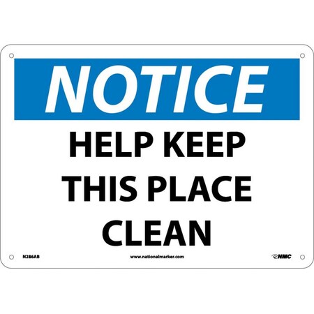 NMC N286AB OSHA Sign, Legend "NOTICE - HELP KEEP THIS PLACE CLEAN", 14" Length x 10" Height, Aluminum, Black/Blue on White