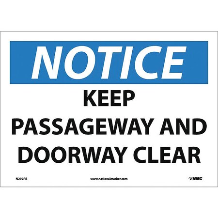 NMC N292PB OSHA Sign, Legend "NOTICE - KEEP PASSAGEWAY AND DOORWAY CLEAR", 14" Length x 10" Height, Pressure Sensitive Vinyl, Black/Blue on White