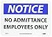 - Visible Composition: the no entry notice sign has legend “NOTICE - NO ADMITTANCE – EMPLOYEES ONLY” in legible letters which helps make it easy to read even from a distance