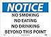 - Visibility: the text “NOTICE - NO SMOKING - NO EATING - NO DRINKING BEYOND THIS AREA” is printed on the sign in clear, bold letters to ensure an easy readability in most lighting conditions and even from a distance