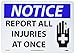 - Visibility: the notice sign displays the band-aid on hand graphic and “NOTICE - REPORT ALL INJURIES AT ONCE” legend in clear, bold letters to ensure maximum visibility in most lighting conditions