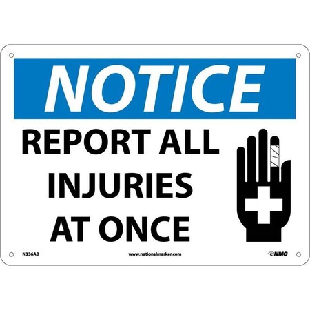 NMC N336PB NOTICE - REPORT ALL INJURIES AT ONCE -14 in. x 10 in. PS Vinyl Notice Sign with Graphic, White/Black Text on Blue/White Base