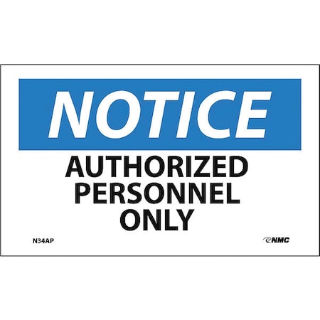 NMC N34AP OSHA Sign, Legend "NOTICE - AUTHORIZED PERSONNEL ONLY", 5" Length x 3" Height, Pressure Sensitive Vinyl, Black/Blue on White (Pack of 5)