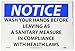 - Visibility: the sign displays the legend “NOTICE - WASH YOUR HANDS BEFORE LEAVING AS A SANITARY MEASURE IN COMPLIANCE WITH HEALTH LAWS” in clear, bold letters for clear visibility