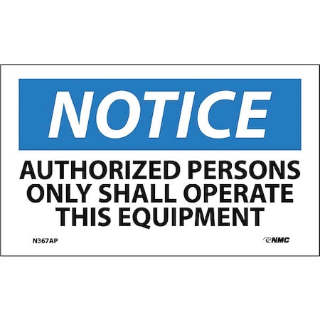NMC N367AP OSHA Sign, Legend "NOTICE - AUTHORIZED PERSONS ONLY SHALL OPERATE THIS EQUIPMENT", 5" Length x 3" Height, Pressure Sensitive Vinyl, Blue/Black on White (Pack of 5)
