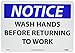| Feature | Header "NOTICE" and legend "WASH HANDS BEFORE RETURNING TO WORK" |