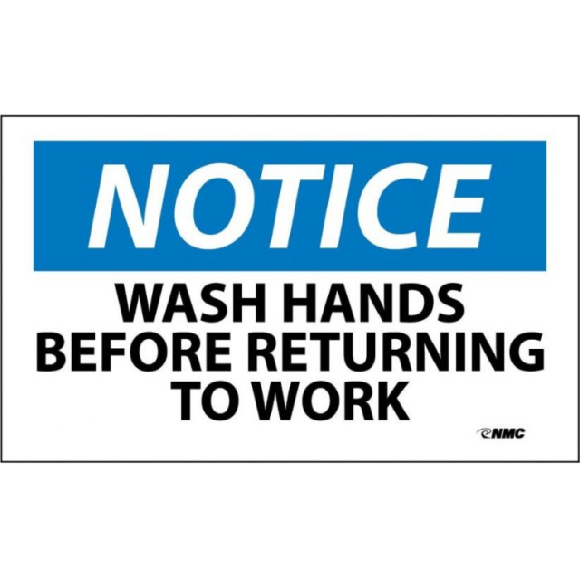 - Header "NOTICE" and legend "WASH HANDS BEFORE RETURNING TO WORK"