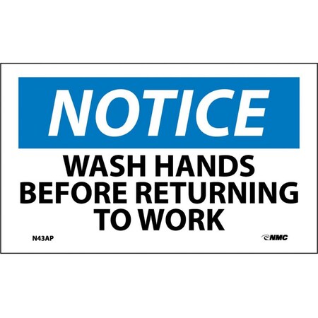 NMC N43AP NOTICE, WASH HANDS BEFORE RETURNING TO WORK, 3X5, PS VINYL, PACK OF 5