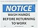 - Header "NOTICE" and legend "WASH HANDS BEFORE RETURNING TO WORK"