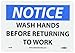 | Feature | Header "NOTICE" and legend "WASH HANDS BEFORE RETURNING TO WORK" |