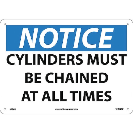 NMC N49AB OSHA Sign, Legend "NOTICE - CYLINDERS MUST BE CHAINED AT ALL TIMES", 14" Length x 10" Height, Aluminum, Blue/Black on White