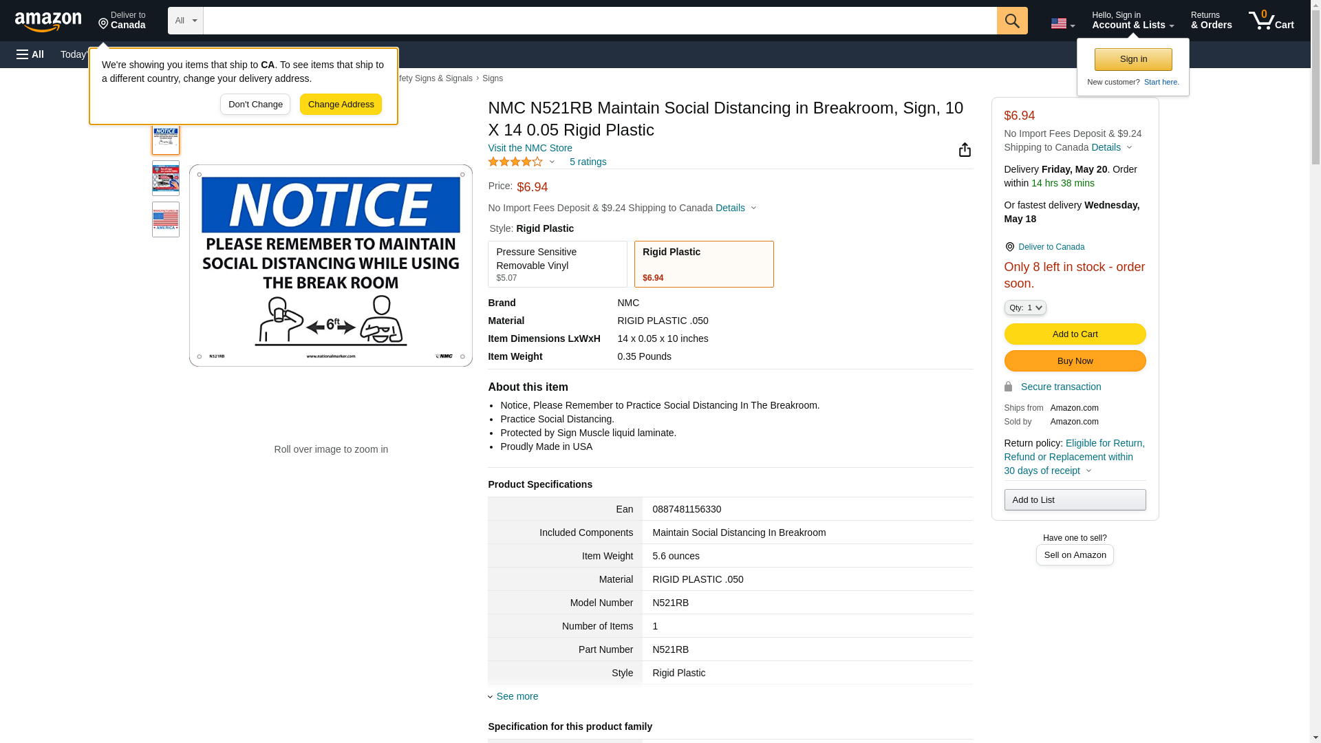 NMC N521RB Maintain Social Distancing in Breakroom, Sign, 10 X 14 0.05 Rigid Plastic
