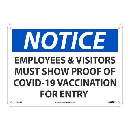 NMC N538AB Notice Employees & Visitors Must Show Proof of COVID-19 Vaccination for Entry, 10 X 14 Sign, Aluminum