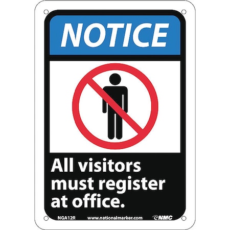 - Clear Visibility: this aluminum notice sign has “Notice - All visitors must register at office.” legend in bold, legible letters to ensure easy readability in crowded areas. The graphic at the center makes the message easy to understand