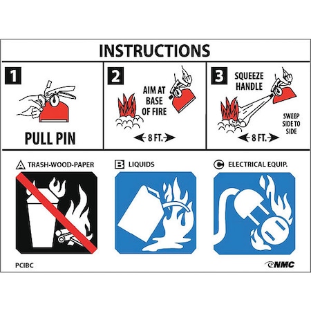 NMC PCIABC Fire Extinguisher Instructions Sign – 5 in. x 3.75 in. Adhesive Backed Vinyl Fire Safety Sign with Graphics, Black Text on White Base
