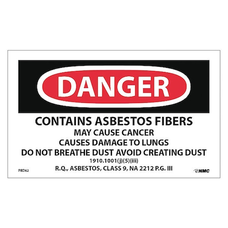 NMC PRD62 Danger - Contains Asbestos FIBERS May Cause Cancer Label - 5 in. x 3 in. PS Paper Hazardous Material Label with White/Black Text on Red/White Base
