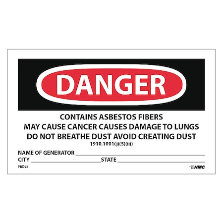 NMC's PRD92 Labels, Danger Contains Asbestos Fibers, Avoid Creating Dust, Cancer and Lung Disease Hazard, Avoid Breathing Airborne Asbestos Fibers, 3 Inch X 5 Inch, PS Paper, 500/Rl