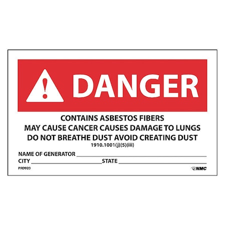 NMC PRD920 Danger Contains Asbestos Fibers Generator Info Warning Label