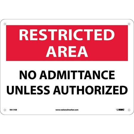 NMC RA17RB Security Sign, Legend "RESTRICTED AREA - NO ADMITTANCE UNLESS AUTHORIZED", 14" Length x 10" Height, Rigid Plastic, Black/Red on White