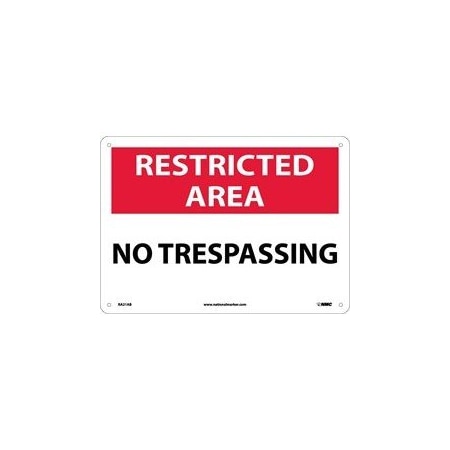 NMC RA21RB Security Sign, Legend "RESTRICTED AREA - NO TRESPASSING", 14" Length x 10" Height, Rigid Plastic, Black/Red on White