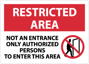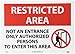 | Feature | Header "RESTRICTED AREA" and legend "NOT AN ENTRANCE ONLY AUTHORIZED PERSONS TO ENTER THIS AREA" with graphic |