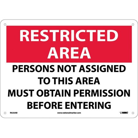 NMC RA25AB RESTRICTED AREA - PERSONS NOT ASSIGNED TO THIS AREA MUST OBTAIN PERMISSION BEFORE ENTERING Restriction Sign - 14in. x 10in., Aluminum Signage