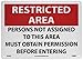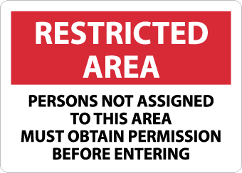 | Feature | Header "RESTRICTED AREA" and legend "PERSONS NOT ASSIGNED TO THIS AREA MUST OBTAIN PERMISSION BEFORE ENTERING" |