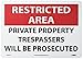| Feature | Header "RESTRICTED AREA" and legend "PRIVATE PROPERTY TRESPASSERS WILL BE PROSECUTED" |