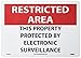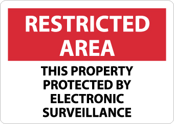 | Feature | Header "RESTRICTED AREA" and legend "THIS PROPERTY PROTECTED BY ELECTRONIC SURVEILLANCE" |