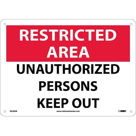 NMC RA29AB RESTRICTED AREA – UNAUTHORIZED PERSONS KEEP OUT Sign – 14 in. x 10 in. Aluminum Security Sign with White/Black Text on Red/White Base