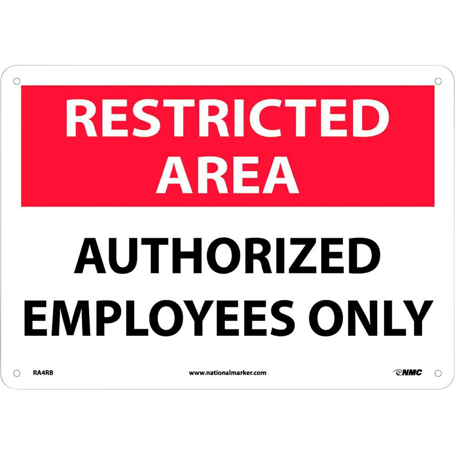 NMC RA4RB Security Sign, Legend "RESTRICTED AREA - AUTHORIZED EMPLOYEES ONLY", 14" Length x 10" Height, Rigid Plastic, Black/Red on White