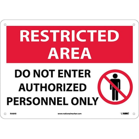 NMC RA8AB Security Sign, Legend "RESTRICTED AREA - DO NOT ENTER AUTHORIZED PERSONNEL ONLY" with Graphic, 14" Length x 10" Height, Aluminum, Black/Red on White