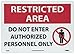 | Feature | Header "RESTRICTED AREA" and legend "DO NOT ENTER AUTHORIZED PERSONNEL ONLY" with graphic |
