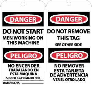 | Feature | Header "DANGER" and legend "DO NOT START MEN WORKING ON THIS MACHINE" and "DO NOT REMOVE THIS TAG" |