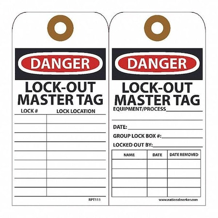 NMC RPT111G "Danger - Lock-Out Master TAG" Accident Prevention Tag with Brass Grommet, Unrippable Vinyl, 3" Length, 6" Height, Black/Red on White (Pack of 25)