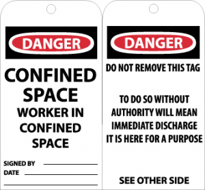 - Header "DANGER" and legend "CONFINED SPACE WORKER IN CONFINED SPACE" and "DO NOT REMOVE THIS TAG, TO DO SO WITHOUT AUTHORITY WILL MEAN IMMEDIATE DISCHARGE IT IS HERE FOR A PURPOSE"