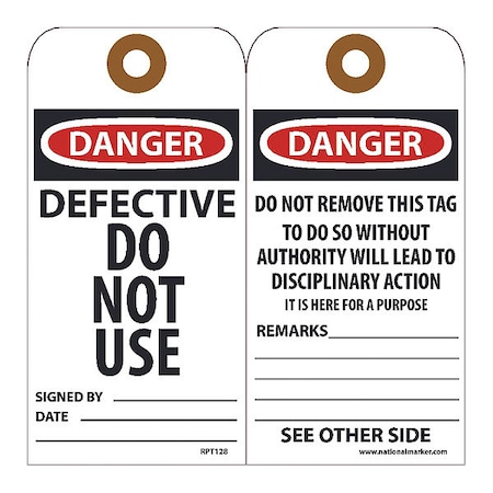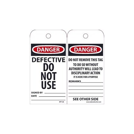 NMC RPT128G, Tag "Defective Do Not Use" (10 Packs of 25 pcs)