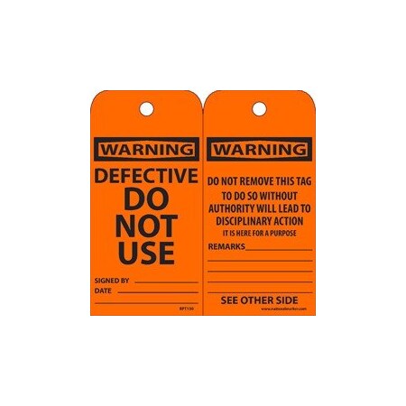 NMC RPT130G"WARNING - DEFECTIVE DO NOT USE" Accident Prevention Tag with Brass Grommet, Unrippable Vinyl, 3" Length, 6" Height, Black on Orange (Pack of 25)
