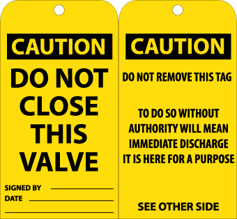 - Header "CAUTION" and legend "DO NOT CLOSE THIS VALVE" and "DO NOT REMOVE THIS TAG, TO DO SO WITHOUT AUTHORITY WILL MEAN IMMEDIATE DISCHARGE IT IS HERE FOR A PURPOSE"