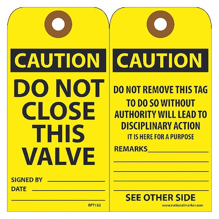 NMC RPT132G "Caution - DO NOT Close This Valve Accident Prevention Tag with Brass Grommet, Unrippable Vinyl, 3" Length, 6" Height, Black on Yellow (Pack of 25)