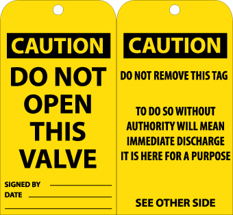 - Header "CAUTION" and legend "DO NOT OPEN THIS VALVE" and "DO NOT REMOVE THIS TAG, TO DO SO WITHOUT AUTHORITY WILL MEAN IMMEDIATE DISCHARGE IT IS HERE FOR A PURPOSE"