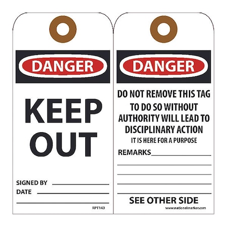 NMC RPT143G, Accident Prevention Tag with Legend: "Keep Out" (10 Packs of 25 pcs)
