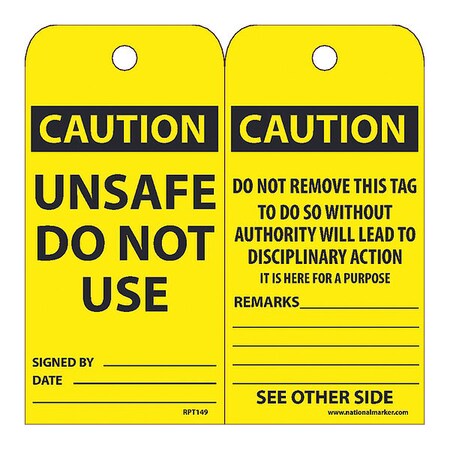NMC RPT149"CAUTION - UNSAFE DO NOT USE" Accident Prevention Tag, Unrippable Vinyl, 3" Length, 6" Height, Black on Yellow (Pack of 25)