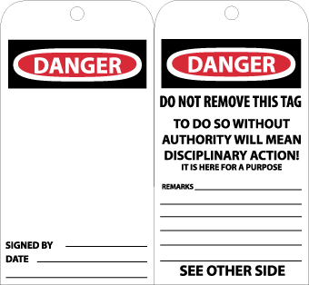 - Header "DANGER" and legend "DO NOT REMOVE THIS TAG, TO DO SO WITHOUT AUTHORITY WILL MEAN DISCIPLINARY ACTION! IT IS HERE FOR A PURPOSE"