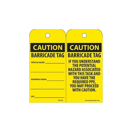 NMC RPT166G Caution – Barricade TAG – [Pack of 25] 3 in. x 6 in. 2 Sided Vinyl Caution Tag with Black/Yellow Text on Yellow Base