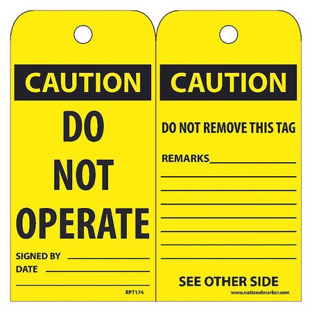 NMC RPT174 Accident Prevention Tag, "CAUTION DO NOT OPERATE", 3" Width x 6" Height, Unrippable Vinyl, Black on Yellow (Pack of 25)