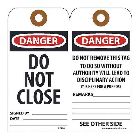 NMC RPT20G "Danger - DO NOT Close" Accident Prevention Tag with Brass Grommet, Unrippable Vinyl, 3" Length, 6" Height, Black/Red on White (Pack of 25)
